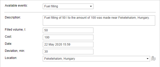 To register fuel filling, select the corresponding event in the drop-down list and fill in the required fields.