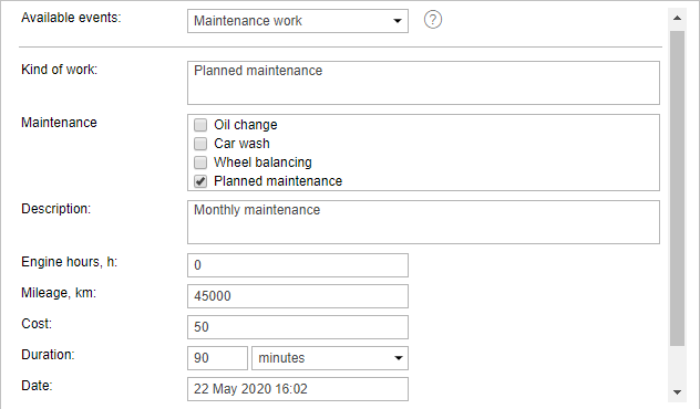 To register maintenance work, select the corresponding event in the drop-down list and fill in the required fields.