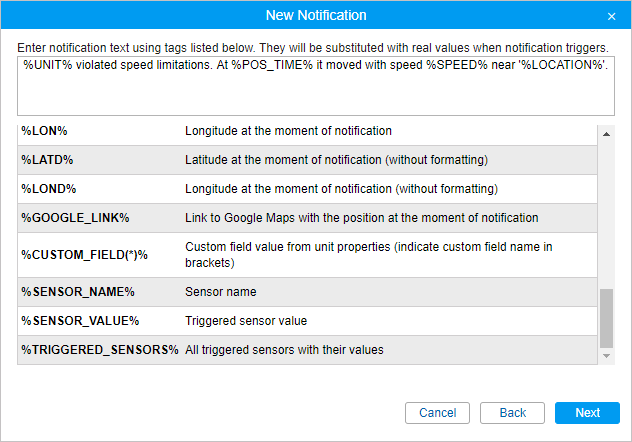 If the data is unknown, the tags are displayed as they are (not substituted with any values). The exceptions are the following tags which do not appear in the notification text when there is no data: %UNIT%, %USER%, %CURR_TIME%, %LOCATION%, %LAST_LOCATION%, %SPEED%, %POS_TIME%, %MSG_TIME%, %UNIT_GROUP%, %ENGINE_HOURS%, %MILEAGE%, %LAT%, %LON%, %LATD%, %LOND%, %GOOGLE_LINK%, %INSURANCE_CASE%, %ZONES_ALL%, %ZONE_MIN%, %UNIT_ID%, %MSG_TIME_INT%, %NOTIFICATION%, %TAG_NAME%, %TAG_ID%, %LOSE_RESTORE%, %LOCATOR_LINK%.