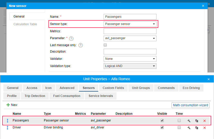 - Create the sensor of the Passenger sensor type in the properties of each unit to which the passenger is supposed to be assigned automatically. The parameter for this sensor depends on your equipment and its configuration.