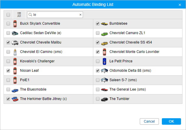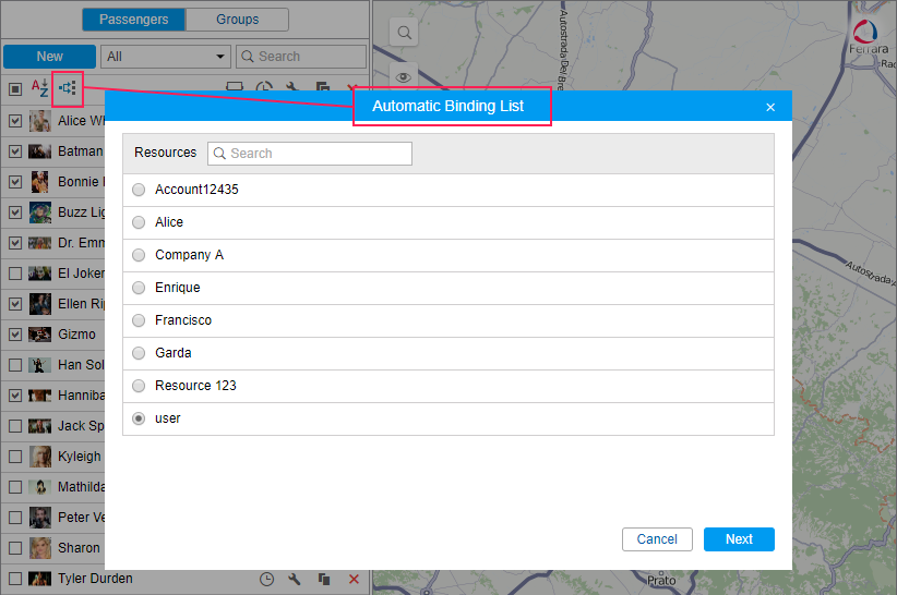 Here you choose a resource whose passengers will be used in automatic binding (with the units selected in the next dialog box). In order to understand what passengers belong to a particular resource, go back to the Passengers panel and apply a filter by resource (a drop-down list to the right of the Create button).