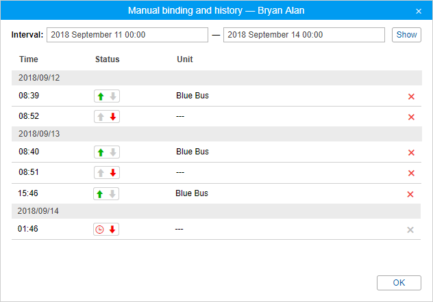 The status of the passenger (except for the Auto checkout status) can be changed manually by clicking on the required icon. To remove the binding or unbinding from the history, press the icon