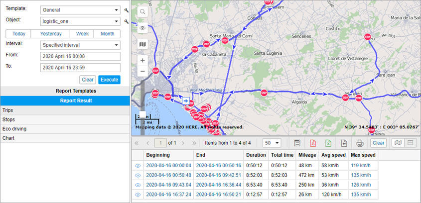 Apart from tables, charts, and statistics, you can view the information on the map: for example, markers and tracks.