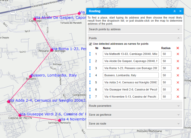 Just make several double-clicks on the map to indicate the key points. If the Use detected addresses as names for points option is enabled in the Points section of the window, the addresses are automatically registered as point names. If the address information is missing, the point is added anyway, but without a name.