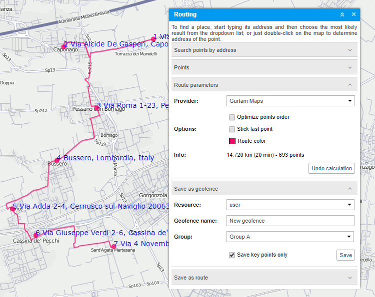When at least two points are set, it is possible to draw the route. To do this, click on the Calculate button. Note that you might want to pre-edit key points, especially if you are going to save this route as a geofence or as a route.