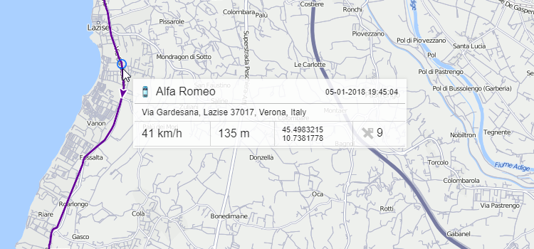 Hover the cursor over a track to get accurate information about a specific point of the track (points where messages were received). Messages are searched in the radius of 50 pixels from the cursor. Points found are highlighted by a pulsating circle, and a tooltip appears with the following information: time, address, speed, altitude, coordinates, satellites, and sensor values. Messages with zero speed are marked with bigger points. Measurements used in the tooltip are borrowed from the unit properties (speed in kilometers or miles per hour, altitude in meters or feet), as well as mileage in the list of tracks. The information from the tooltip can be copied to the clipboard.