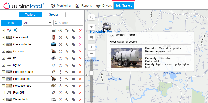 Trailers in the Wialon monitoring system are any mechanisms attached to or driven by the main vehicle (unit) and not having their own trackers or controllers. In functionality, trailer monitoring is similar to driver monitoring.