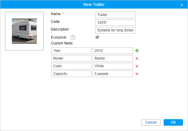 Go to the Trailers panel and press the New button. In the dialog that opens, fill in the name, identification code (for automatic binding), description, and custom fields. This information is shown in the trailer’s tooltip and used in reports. You can upload an image for the trailer which will be used to show the trailer in the list and on the map. It is recommended to upload square images so that their proportions are not distorted. The properties that can be assigned to trailers are the same as for drivers.