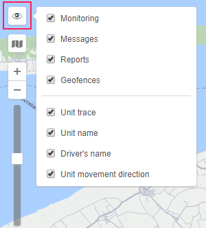 Such panels as Monitoring, Tracks, Messages, Reports, Geofences, Routes, Drivers, Trailers and Passengers can have their layers on the map. Graphic elements applied to a map when working in a particular panel, can be easily switched on and off. Displaying or hiding the graphic information on the map is adjusted for each layer individually in the layers menu, which can be opened by clicking on the Eye icon in the upper left corner of the map. Here you can read more about the work area.