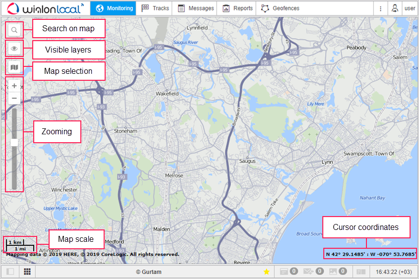 The base layer selected in this menu affects only the graphical form of the map. Geocoding (address detection, etc.) is carried out using mainly Gurtam Maps.