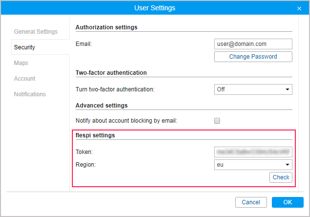 In the user settings in Wialon, the region is displayed automatically for the generated token. If you indicate the token manually, select its region in the drop-down list.