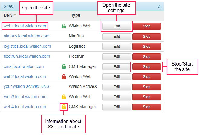 If you activate additional Wialon Web sites (the Extra site module), you can change their type to CMS Manager. You can also add several Wialon Mobile sites. Each of the additional sites should have its own DNS. The sites of the Wialon Web type can have a personal design (paid option).