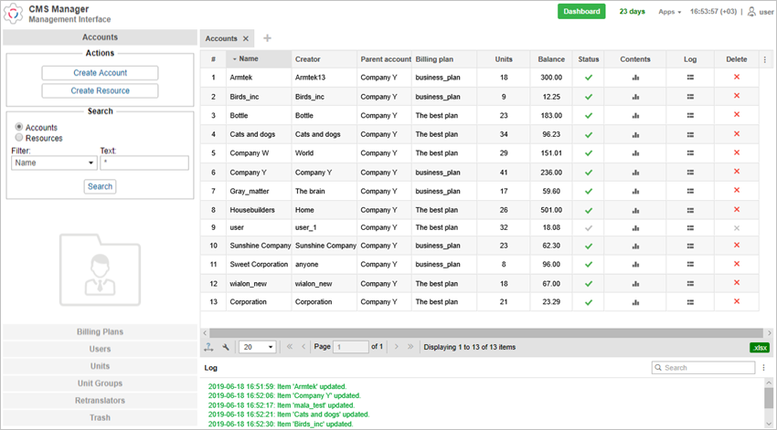 These functions can be also partially fulfilled in the user interface. However, the main difference here is that CMS Manager has a handy easy-to-use interface that allows to work with a great number of items, filter them by different criteria, display them in the form of a table, create tabs with search results, and much more. Besides, the exclusive privilege of CMS Manager is the possibility to work with accounts (that is to control payment, restrict services and adjust their cost) and retranslators.