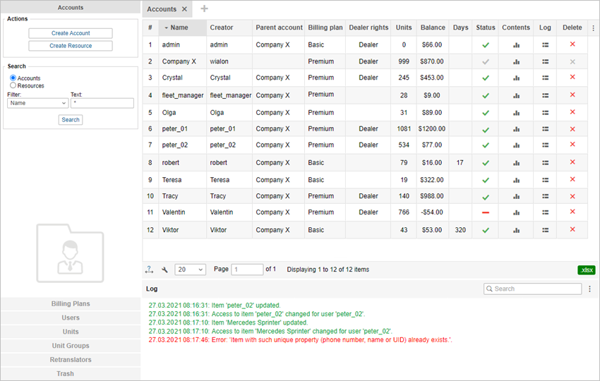 The Results panel for an account displays its name, creator, parent account, billing plan, presence of the dealer rights, number of units in it and in the subordinate accounts (taking into account the access rights of the creator), current balance, number of days left (the estimated blocking date is shown in the tooltip), status (active or blocked), date of blocking (if blocked), icons for querying a report on the account contents, open the log and for deleting the account.