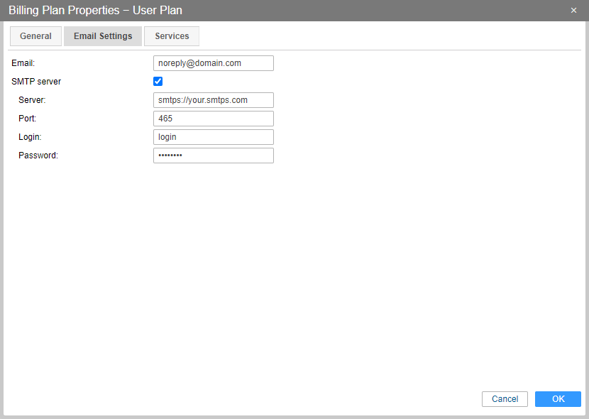 System messages can be sent using your SMTP server. To adjust this setting, enter the email address and activate the SMTP server option. Next, specify the server, port, login, and password. Make sure that the protocol (smtp or smtps) is specified in the server address. Usually, ports 25 and 587 are used for smpt, and 465 — for smtps.