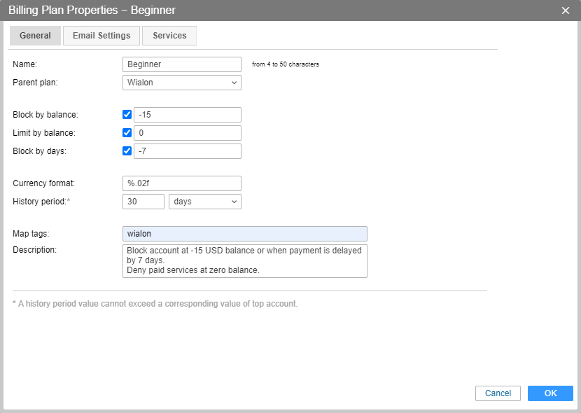 The Billing plan properties dialog opens when you click on the name of the billing plan in the list. Here you can adjust the settings of the billing plan. Some of them may be redefined in a particular account separately.