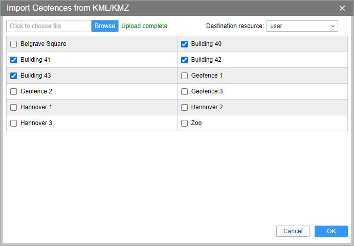 Indicate the path to a proper file and press Upload. The file is processed on the server, and its contents are displayed below. Check items to be imported and select a destination resource. In the dropdown list, you can see only those resources to which you have Create, edit, and delete geofences access.