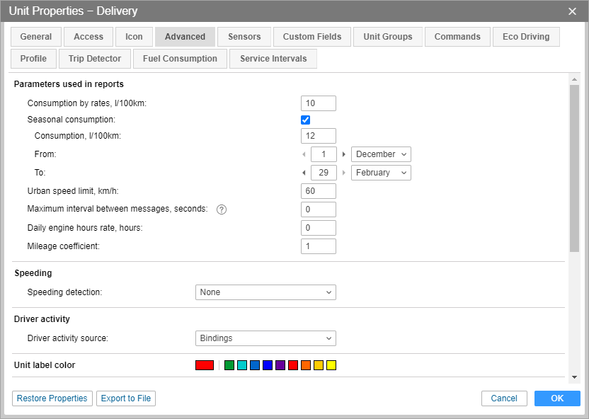 On the Advanced tab of the unit properties, you can specify various parameters for generating reports, adjust colors for tracks, and set speed limitations.