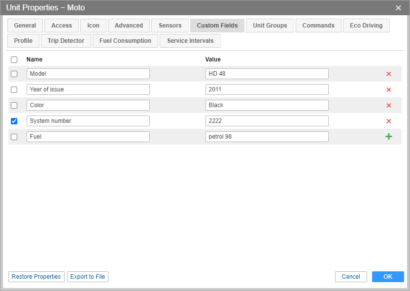 On the Custom fields tab of the unit properties, you can create fields that display additional information about the unit, for example, fuel type, year of manufacture, load capacity, etc. Moreover, here you can indicate any external links. Some of these fields can be marked as administrative (the checkbox before the field), i.e. they are visible only to users with the appropriate rights.