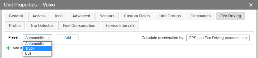 In the top left part of the Eco driving tab window, select one of the three available templates: Automobile, Truck, Bus.