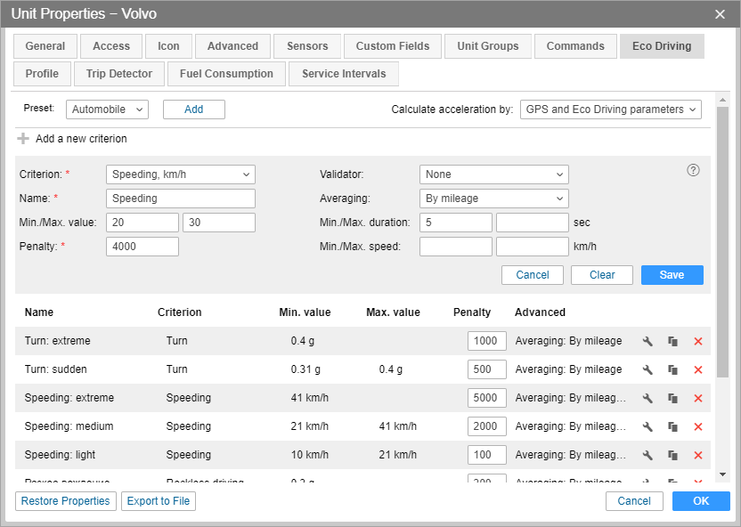 The criterion is a key parameter on the basis of which a driving quality can be determined. Wialon system supports the work with the following criteria: speeding, acceleration, braking, turning, reckless driving, and a custom one. Detailed information on every criterion is presented below.