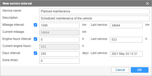 Done times: here you indicate how many times this kind of service has already been done. This number can be entered into the field manually or changed automatically when registering a service of this kind. Besides, after registration, the time of the Last Service changes, and the count of days/mileage/engine hours are zeroed and started again.