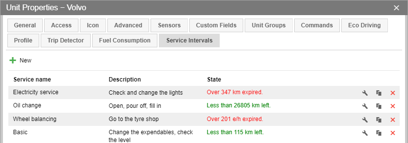 On the Service intervals tab of the unit properties, you can define maintenance intervals to perform all the necessary maintenance activities in time.