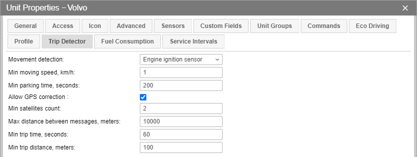 The trip detector is configured in the unit properties and is used to detect movement intervals (trips) and idles (stops, parkings). Depending on the equipment and settings on this tab, the reports, depending on the intervals of movement and idles, can look quite different. Therefore, it is important to set the correct settings here.
