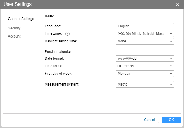 | General settings | Here you can indicate your time zone, email, change the password, etc. |