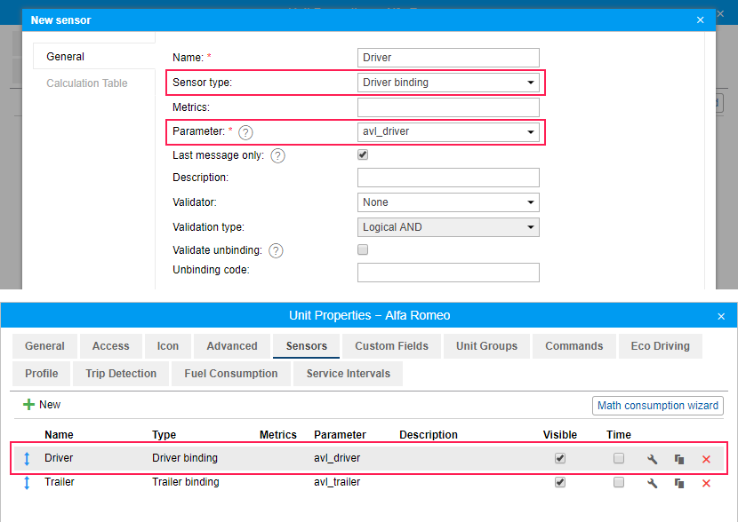 1. A special sensor of Driver binding type should be created in the properties of each unit intended for auto-binding. A parameter for this sensor can be avl_driver or some other depending on your equipment and its configuration. One or more driver sensors can be created on the basis of different parameters. If more than one driver binding sensor exists within a unit, the option Validate unbinding can be useful. If the option is activated, a driver bound to a unit automatically can be unbound from this unit only if the empty value comes from the same parameter that was used to bind the driver. Otherwise, the driver reset coming from any parameter will lead to the reset of all drivers bound to this unit.