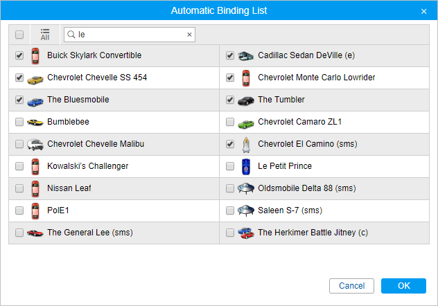 Upon clicking on the Automatic binding icon, a list of available resources is opened.