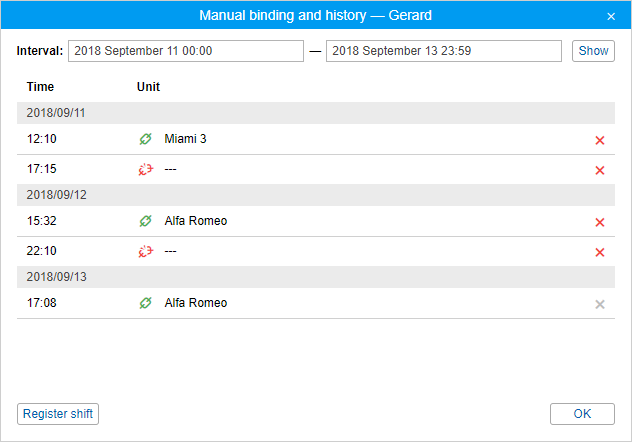 This option allows you to view the history of bindings, remove them if necessary, and register the driver’s shift manually. To perform these actions, click on the Register work interval icon (
