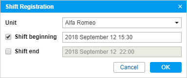 To register a shift manually, click on the Register shift button in the lower left corner of the dialog box. Next, select the unit and specify the beginning and/or end of the shift. To activate the field of the shift end, select the check box next to it.