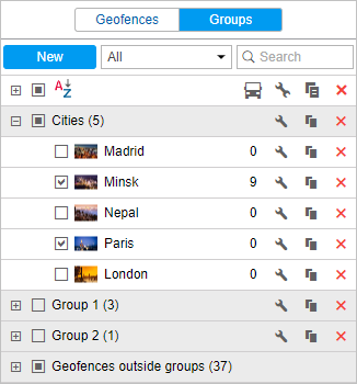 To work with groups, choose the corresponding mode in the Geofences panel.