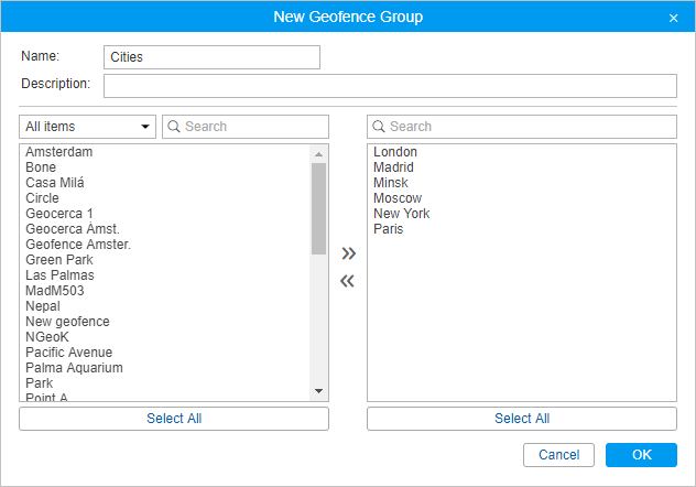 To create a new group of geofences, click on the New button. Enter a name and description, and choose geofences to be included in a group. Click OK.