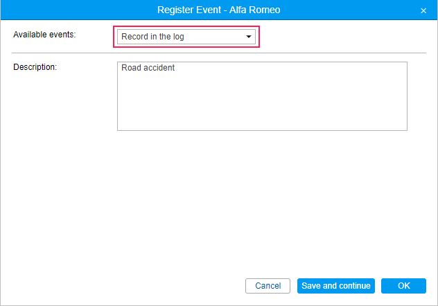 Fill in the required fields and click OK. If you need to register several events for one unit, click Save and continue. The entry will be added to the log (the corresponding caption appears in the lower-left corner of the dialog), and you can proceed to register the next event.