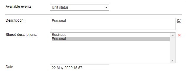 This option allows registering the unit state which can be later displayed in reports. For example, when using a vehicle for personal and official purposes, you can register the start of personal or official use of the vehicle.