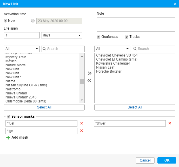 You can also check the Geofences box here to share them in the link. Moreover, you can provide the possibility of generating and viewing the track of a unit by activating the Tracks checkbox.