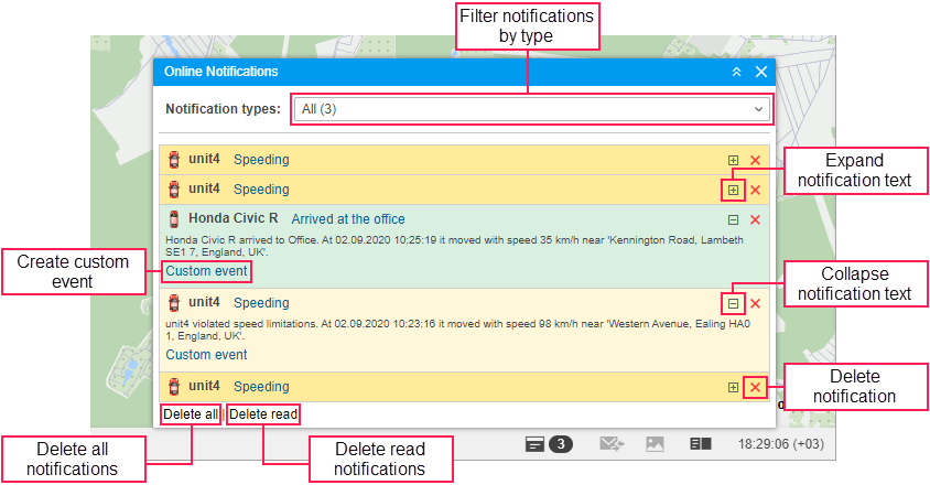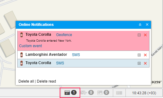 next to its name. You can also delete all notifications or the read ones by clicking Delete all or Delete read at the bottom of the window of online notifications.