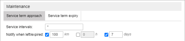 First, you choose trigger type: notify when service term approaches or notify when service term is expired. Then indicate the interval before or after the term for the notification to trigger. This interval can be in days, kilometers, engine hours, or together. You can control either all intervals existing in the Service intervals tab in unit properties or just several intervals. To specify target intervals, enter a name mask using wildcard symbols like an asterisk (*) and question sign (?). Then indicate how much mileage, or time, or how many engine hours should be left or expired to make the notification trigger.