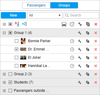 Some standard actions are available for passengers in a group (open the group to display the action icons).