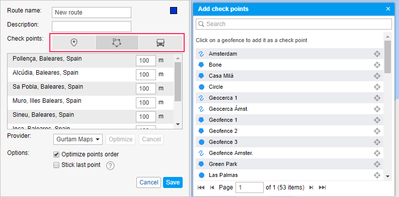 | Add check points from geofences | Clicking on this button opens the list of available geofences. The type of the geofence (circle, line, polygon) is shown graphically to the left of its name. Click on geofences to add them as check points. |