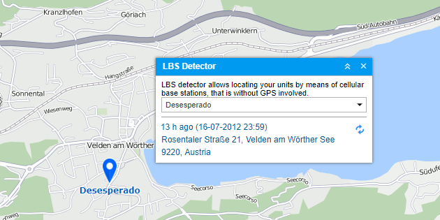 After the unit is chosen, a search starts automatically. Then the map is centered on the found location identified with the blue marker. Also, unit’s name can be enabled/disabled below the marker by pressing the corresponding button in the bottom panel. Moreover, the LBS detector window shows such information as the time of defining the latest location and its address. To the right of this data, there is a Refresh button pressing which the location information will be updated.