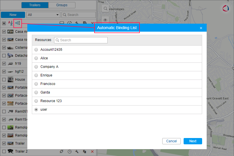 Trailers, the same as drivers, can be bound to units either manually or automatically.