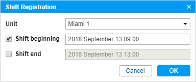 To register a shift manually, click on the Register shift button in the lower left corner of the dialog box. Next, select the unit and specify the beginning and/or end of the shift. To activate the field of the shift end, enable the Shift end option.