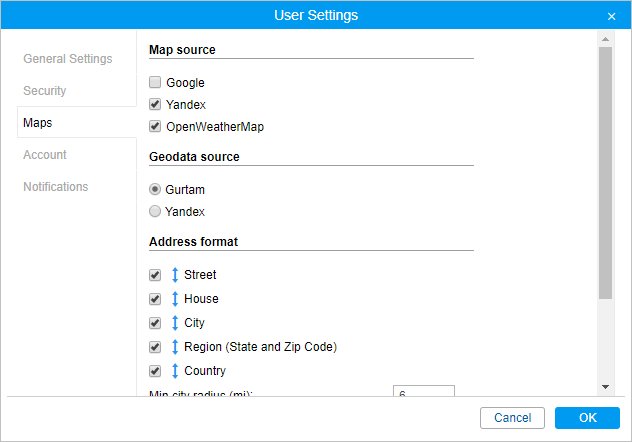 If a geodata source other than Gurtam is chosen, the Address format block becomes unavailable.