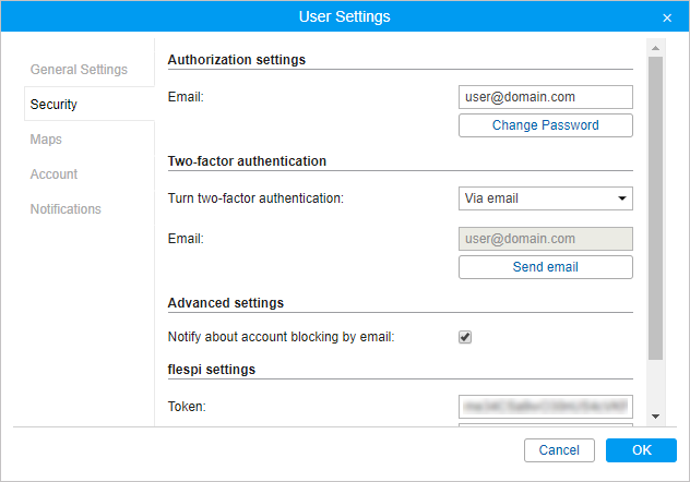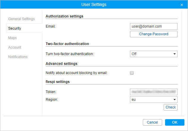 In the user settings in Wialon, the region is displayed automatically for the generated token. If you indicate the token manually, select its region in the drop-down list.
