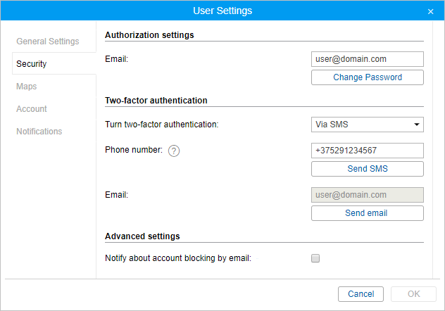 To enable two-factor authentication, in the drop-down menu select the method of receiving the confirmation code: via email or SMS.