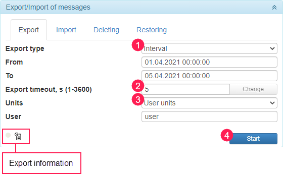2. In the Export timeout field, specify the timeout duration between the exports of messages from different units if there are several of them. The timeout allows avoiding the system overload. To save the specified value, click Change .