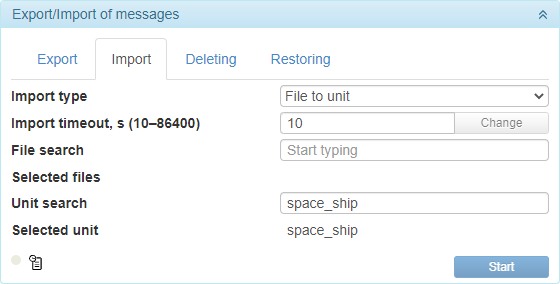 This section is designed for bulk background import and export of messages from units. The section consists of four tabs on which you can perform the following operations: